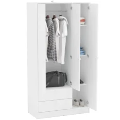 Wardrobe/Armoire by Inval finished in a rich “Espresso” laminates in durable melamine which is stain, heat and scratch resistant. Constructed from manufactured wood The unit has a functional design and is an excellent choice for your home or home office. It features two doors with brushed chrome metal handles, a hanging bar that provides spacious area for hangers and two top shelves for additional storage. The unit sits on four plastic floor gliders for easy repositioning.