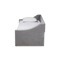 A comfortable place to lounge or sleep, the Delora daybed brings versatility to any space. This wood daybed is upholstered in a soft, resilient polyester fabric and is padded with foam for the utmost comfort. Flared arms and elaborate button tufting lend a classic, refined look. Designed for both style and function, the Delora is fitted with a roll-out twin size trundle bed to provide convenient accommodation for overnight guests. The Delora daybed is made in Malaysia and requires assembly.